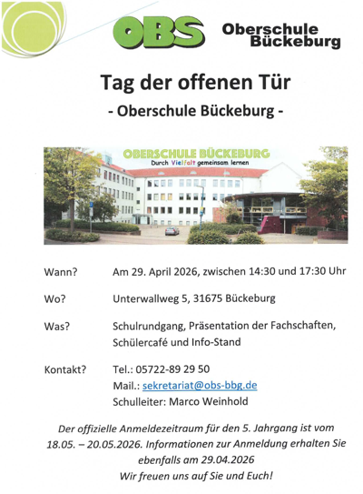 Willkommen auf der Homepage der Oberschule BückeburgSeit Beginn des Schuljahres 2012/2013 sind wir eine Oberschule im Stadtgebiet Bückeburg. An unserer Schule werden Schülerinnen und Schüler in den Jahrgängen 5 - 10 beschult. Zurzeit besuchen 388 Schülerinnen und Schüler der Stadt Bückeburg unsere Schule am Unterwallweg. Die Oberschule Bückeburg ist von Anfang an eine teilgebundene Ganztagsschule. Das heißt, dass an zwei Nachmittagen (montags und mittwochs) verpflichtender Unterricht stattfindet und an zwei weiteren Nachmittagen AGs angewählt werden können. In unserer Mensa wird montags bis donnerstags ein Mittagessen angeboten - zur Wahl stehen täglich mehrere Gerichte. Neben den Lehrkräften haben wir eine Schulsozialarbeiterin für die größeren und kleineren Probleme des Alltags und ein Team von Berufseinstiegsbegleiterinnen, die unsere Schülerinnen und Schüler im Bereich der Berufsorientierung und im Berufseinstieg beraten und unterstützen. Im Rahmen des Inklusiven Unterrichts an unserer Schule unterstützen uns Förderschullehrkräfte im Schulalltag.